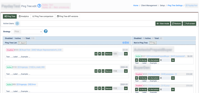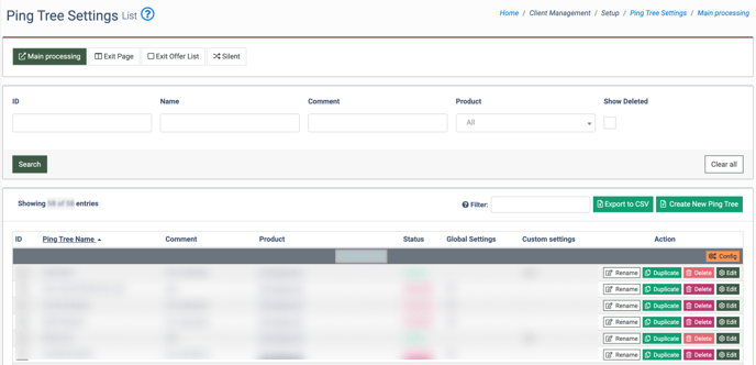 To access the list, go to the Client Management > Setup > Ping Tree Settings section.