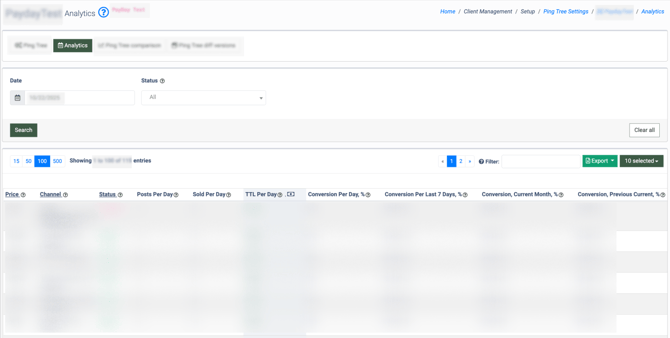 The “Analytics” tab allows you to view and analyze the report that contains the performance overview of the Ping Tree for a specific date. To load the performance data, use the “Date” and “Status” filters and click the “Search” button.