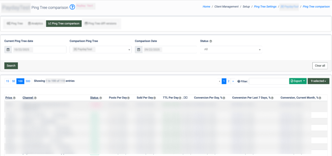 The "Ping Tree comparison" tab allows you to compare the Ping Tree performance between two selected periods. To generate the report, use the "Current Ping Tree date," "Comparison Ping Tree," "Comparison Date," and "Status" filters, and click the "Search" button.