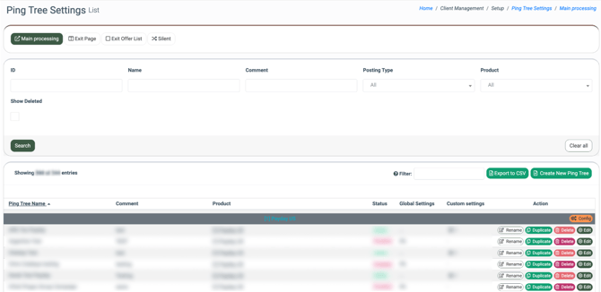 Main processing: The tab displays a list of all ping trees for the Main processing Campaign type, grouped by the Product (for LMS only).