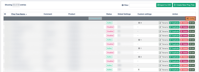 To configure the ping tree distribution for the specific Product, go to the Ping Tree Settings section for the specified Product and click the “Config” button.
