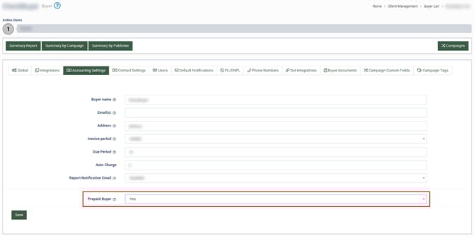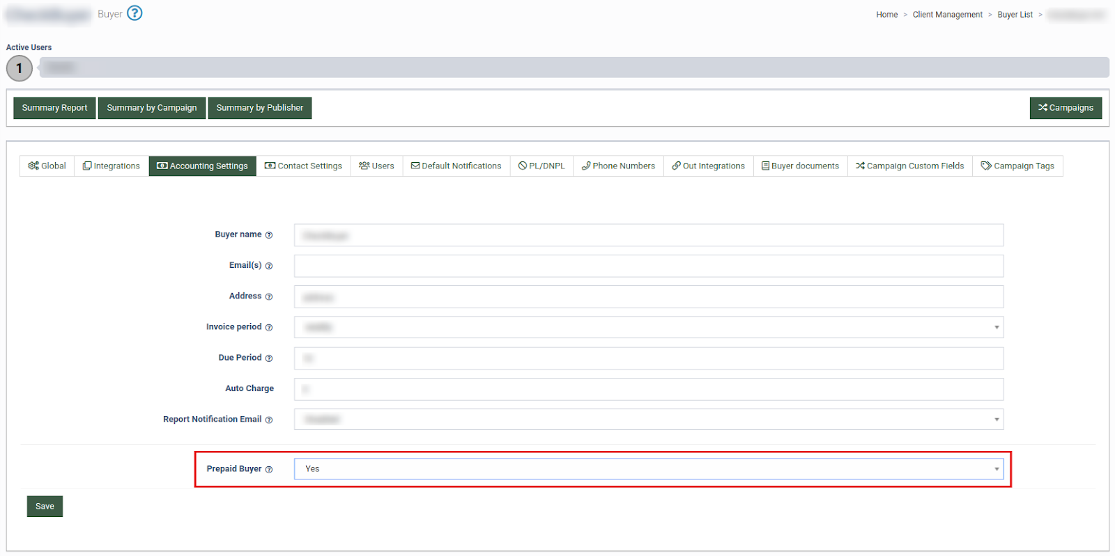 To enable the Prepaid Buyer option, go to the Client Management > Buyer List section, select a Buyer from the list, and click the “Settings” button in the “Actions” column. On the Buyer setup page, open the “Accounting Settings” tab and select the “Yes” option in the “Prepaid Buyer” drop-down list.