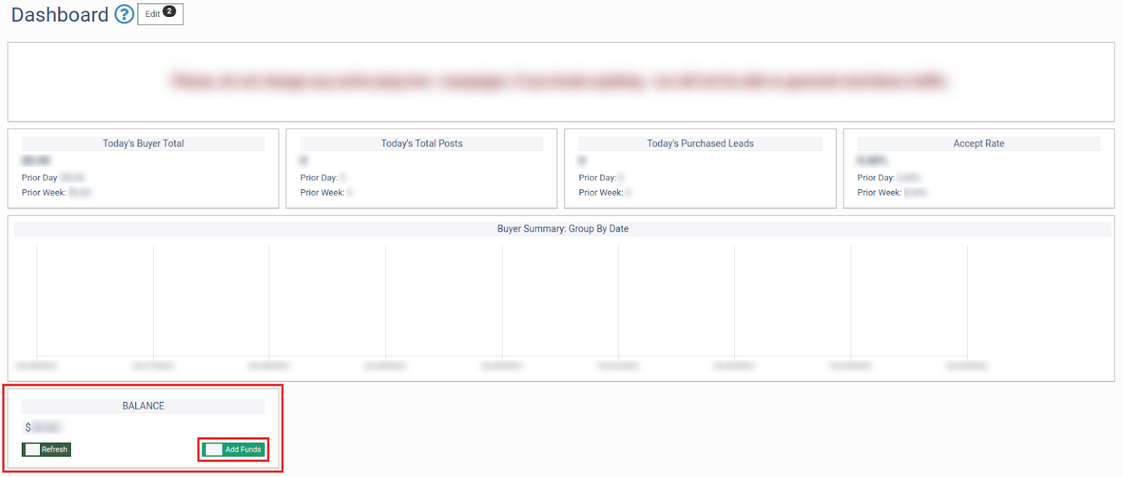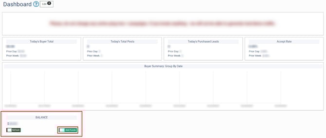 The balance can be replenished in LMS or Call Logic by a Buyer Representative user with the Buyer Editor role. To replenish the balance, go to the Global Dashboard and select the preferred Phonexa product. Once redirected to the welcome page, click the “Add Funds” button on the “Balance” widget. Learn more about the Balance widget in the Knowledge Base article.