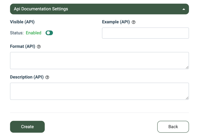 Press the “API Documentation Settings” button and fill in the following fields to add the set of parameters to the API: