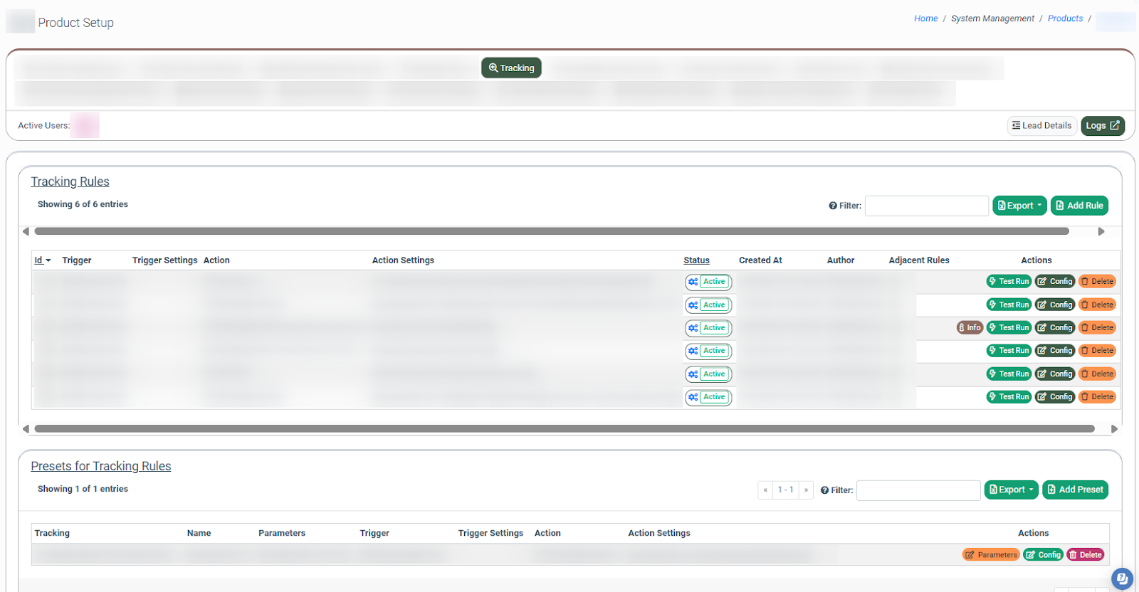 To manage Integration Rules, go to the System Management > Products section, select the Product from the list, and click the “Settings” button in the “Actions” column. Select the “Tracking” tab on the Product Setup page.