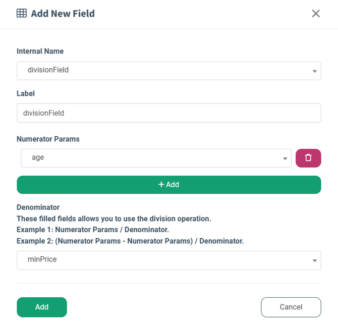 - Numerator Params: Select the field for the numerator. Click the “Add” button to add another numerator.