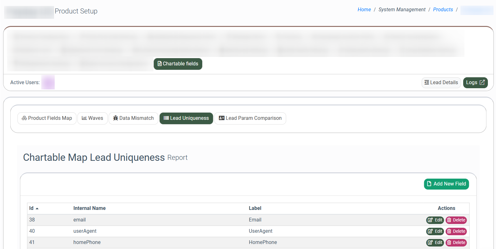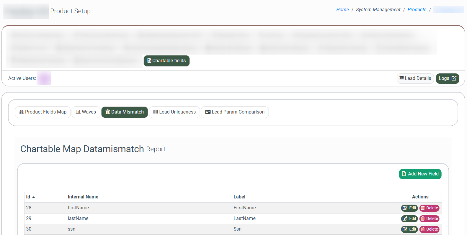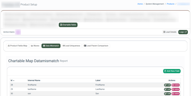 The “Product Fields Map” tab allows you to configure the parameters that determine how data is collected for the Data Mismatch Summary, Data Mismatch Details, Lead Uniqueness, Lead Parameter Comparison, and Waves reports.