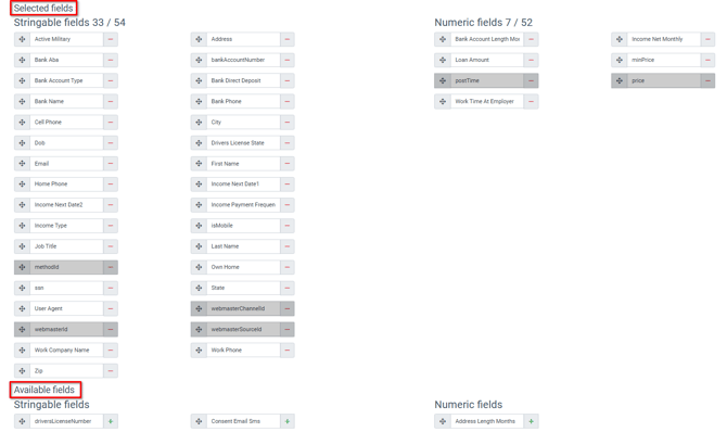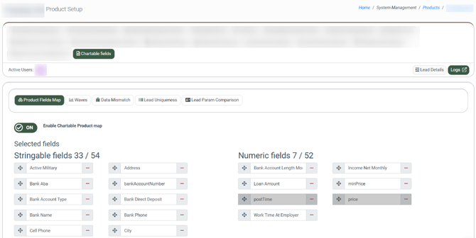 To enable fields mapping, switch the toggle “Enable Chartable Product map”. There are two field types: string and numeric. To start collecting data for a specific parameter, move the field from the “Available Fields” block to the “Selected Fields” block.