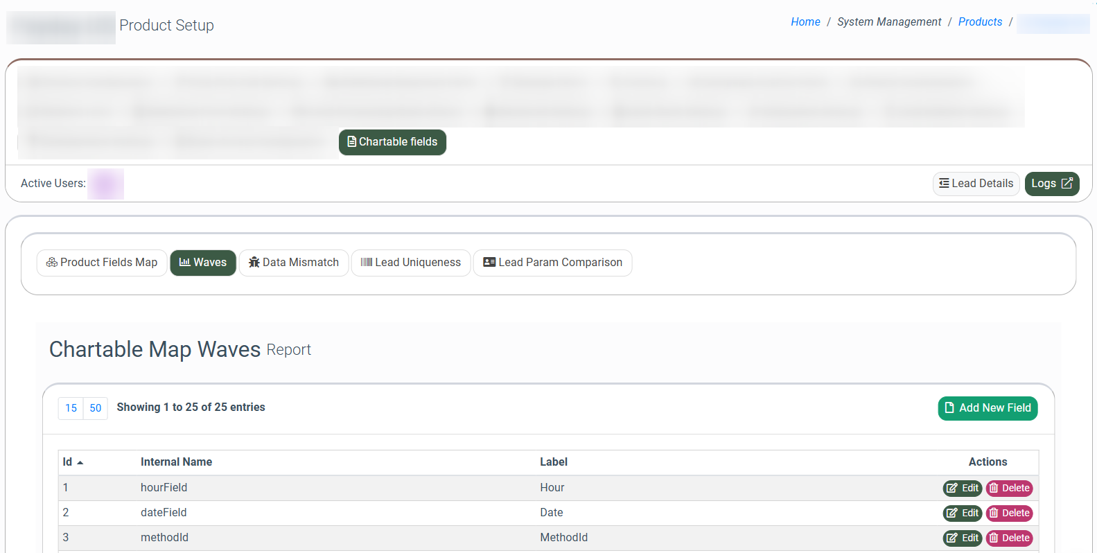 To manage the settings, go to the System Management > Products section, select the Product from the list, click the “Settings” button in the “Actions” column, and select the “Chartable fields” tab.