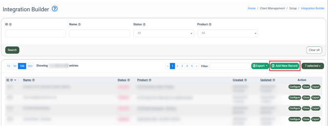 To import the downloaded product schema for further usage during the integration building process, go to the Client Management > Setup > Integration Builder section, and click the “Add New Record” button.
