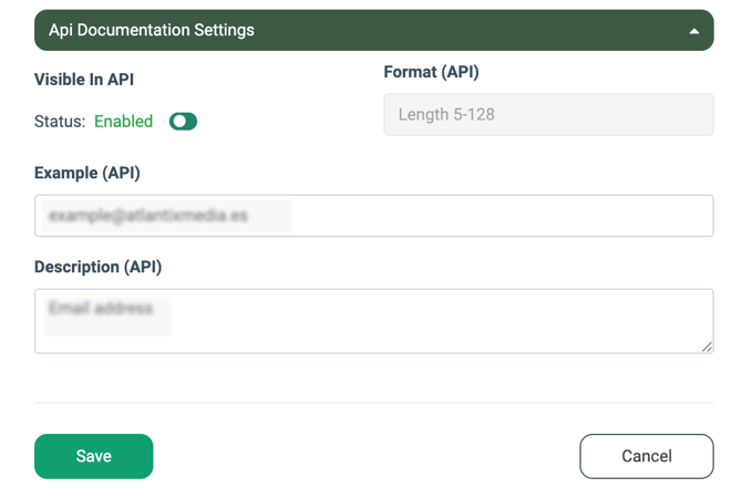 - Format (API): Add the format example for the field that will be displayed in the API documentation.