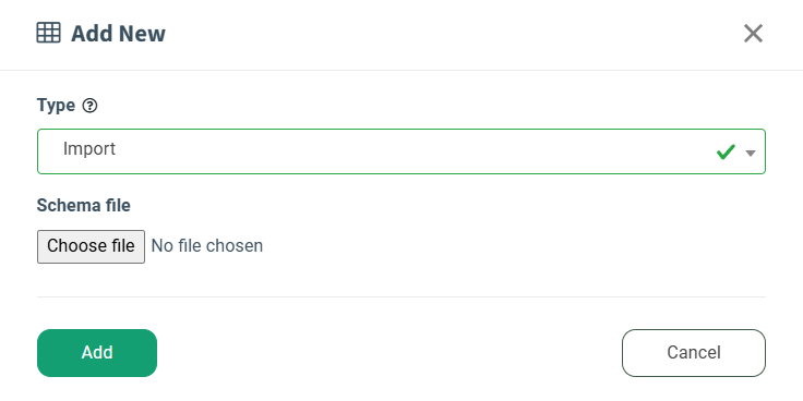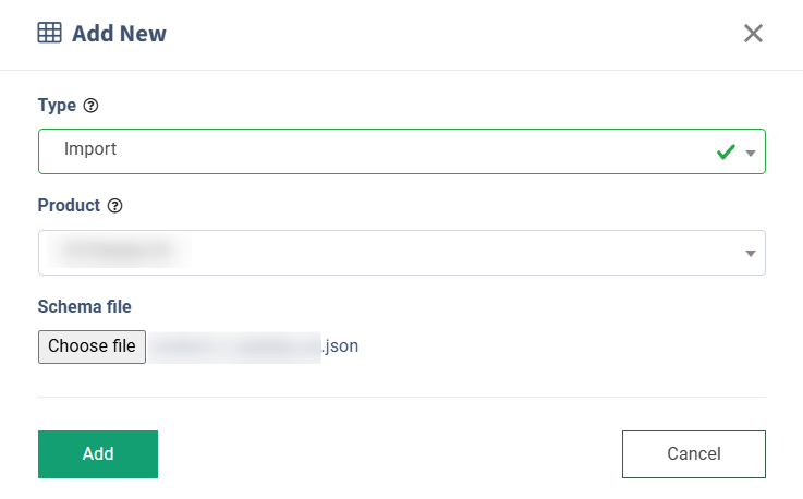 Select the “Import” option in the “Type” field, select and upload the corresponding JSON file in the “Schema file” field of the “Add New” pop-up window. Once the file is uploaded and appears in the pop-up window, select the product for the integration building in the “Product” field.