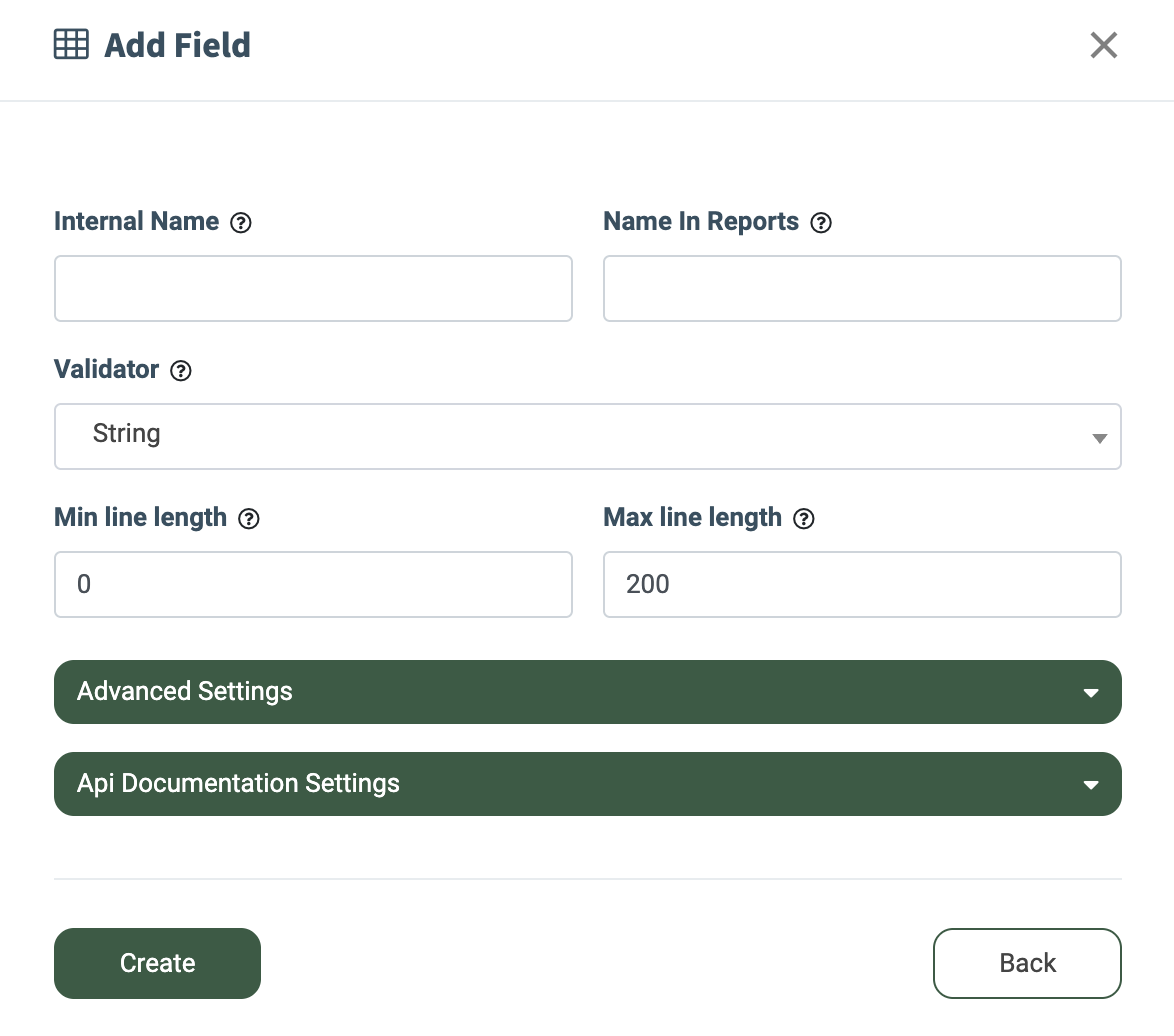 - String: The field type for the string data input. Fill in the “Min line length” and “Max line length” to determine the accepted string length.
