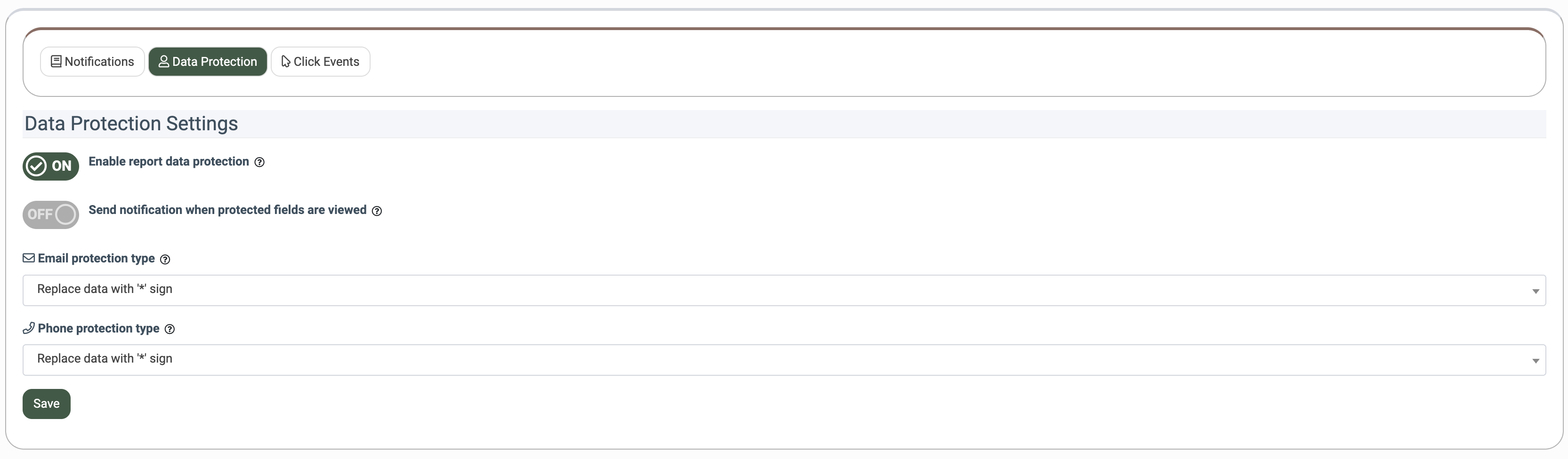 The Data Protection tab allows you to control how sensitive data is displayed and accessed within reports. These settings help safeguard personal information by applying protection rules to email and phone fields, while providing visibility into when protected data is viewed.