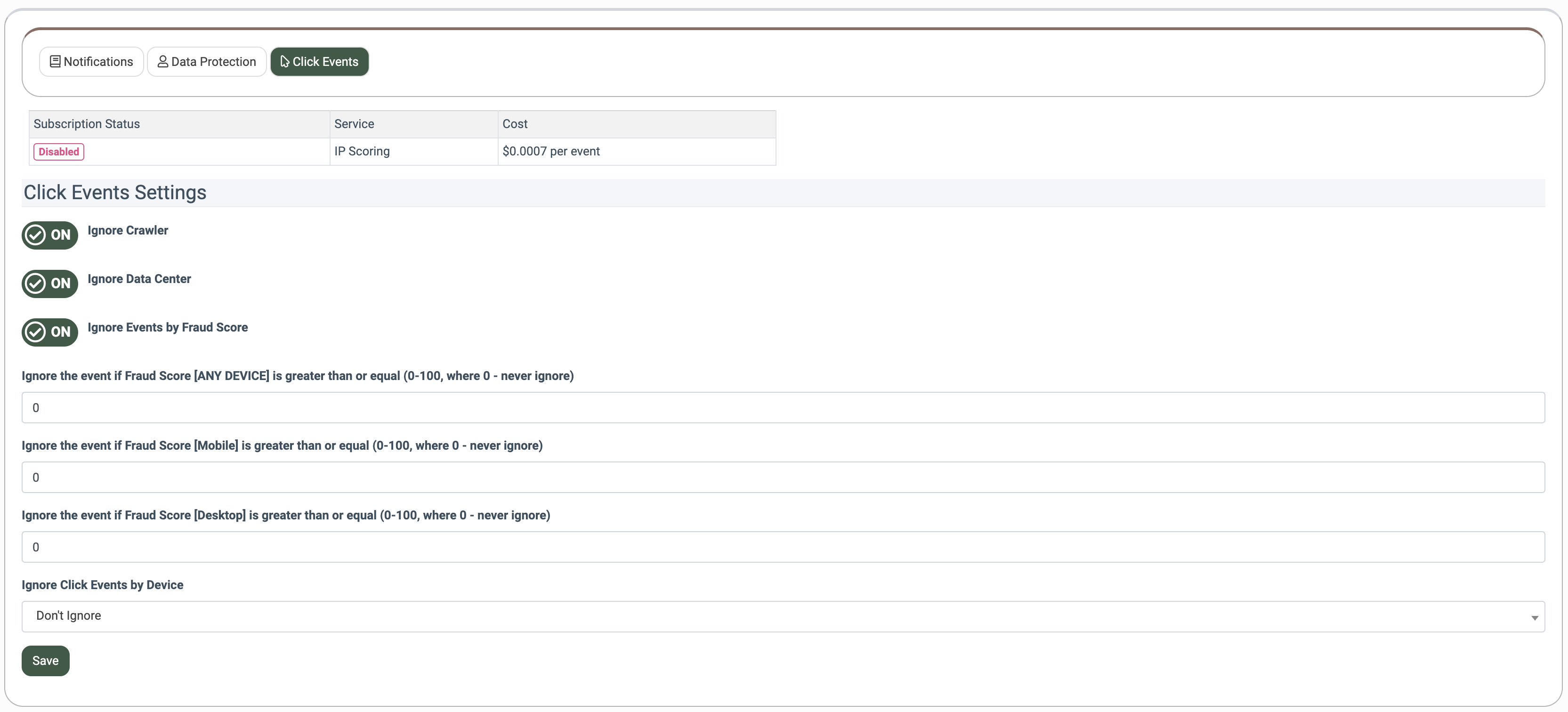 - Ignore the event if Fraud Score [ANY DEVICE] is greater than or equal (0-100, where 0 - never ignore): Ignores click events from any device based on the fraud score returned by the IP Scoring service. Applies to both mobile devices and desktop devices. Filters suspicious traffic when the score is equal to or exceeds the set score. A value of 0 means clicks are never ignored.