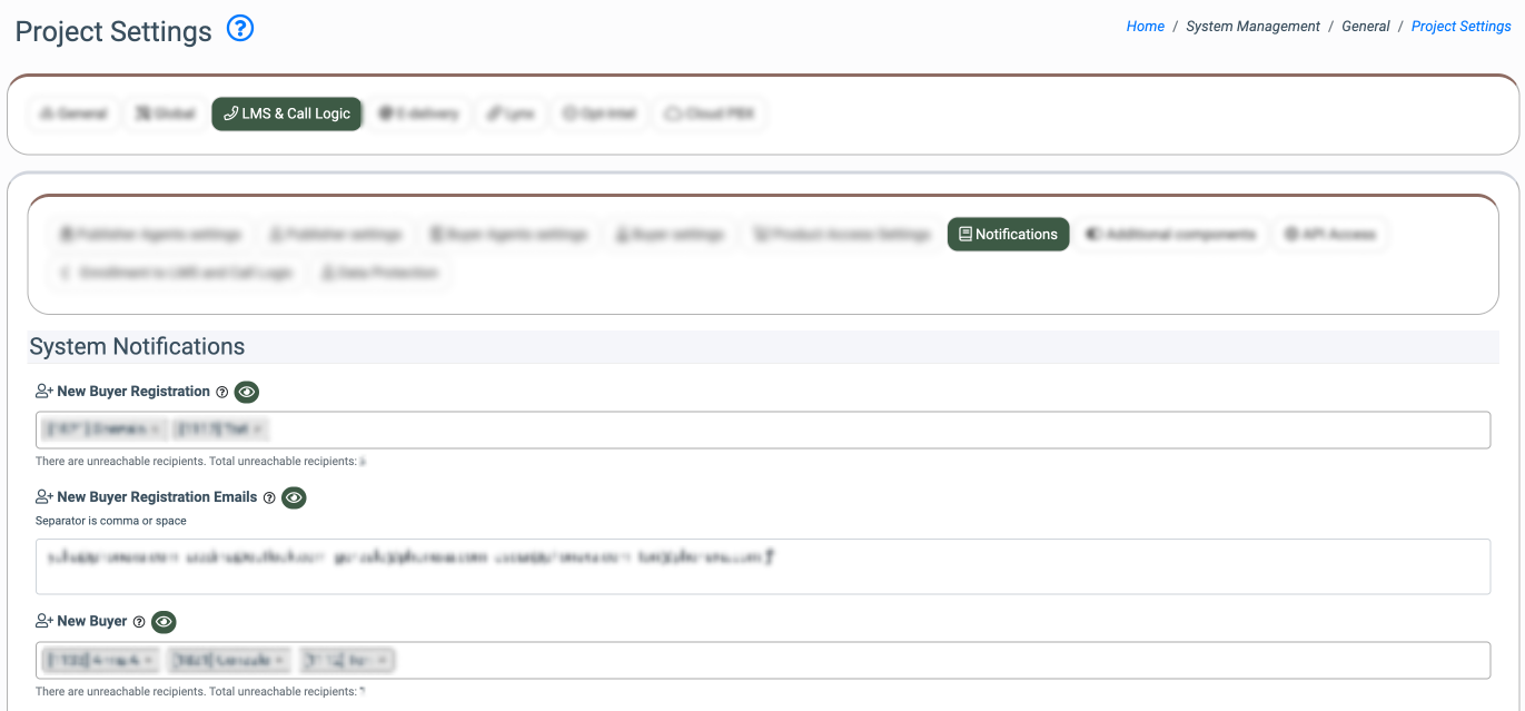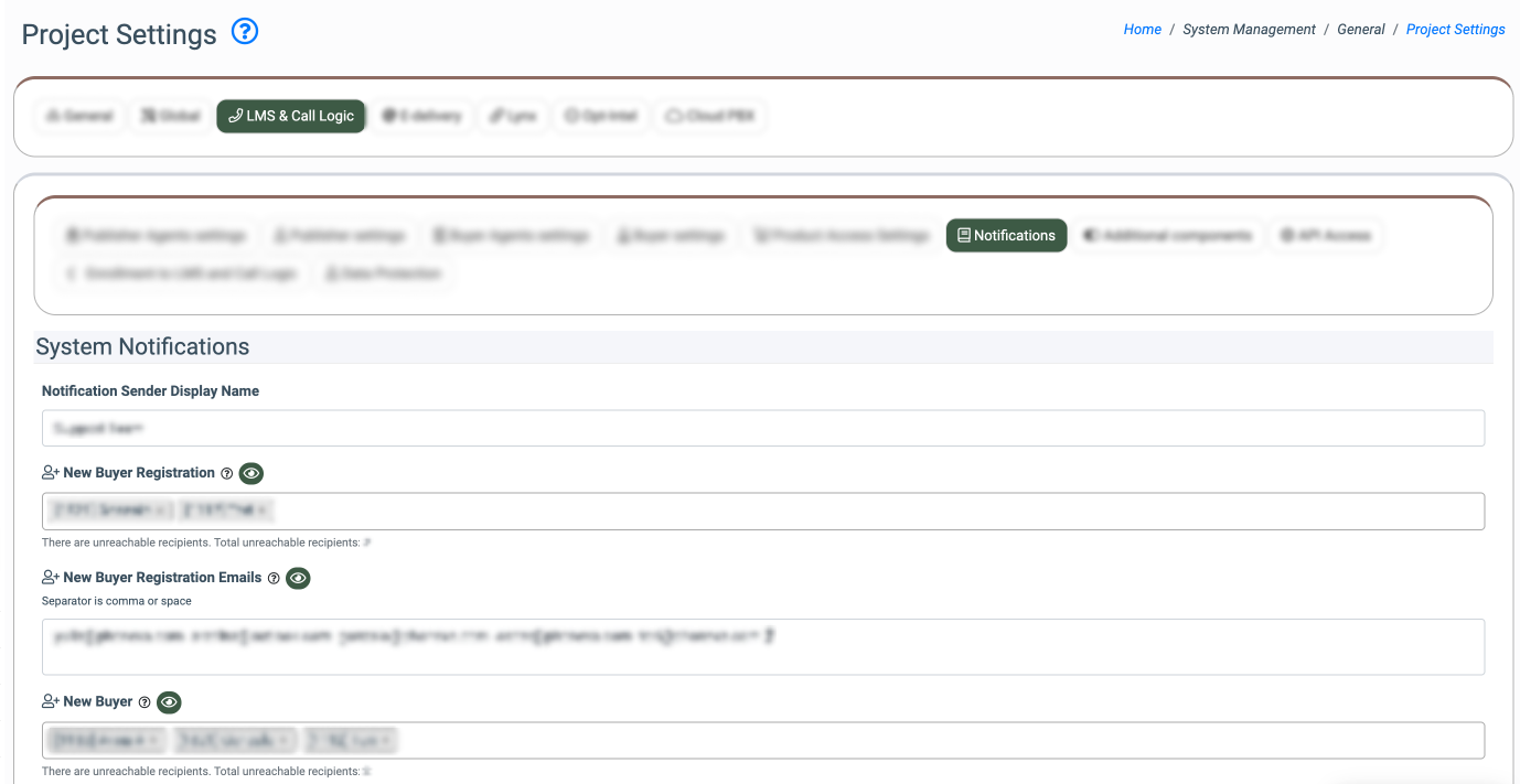 To view this tab, go to the System Management > General > Project Settings section, click the “LMS & Call Logic” tab, and select the “Notifications” subtab.