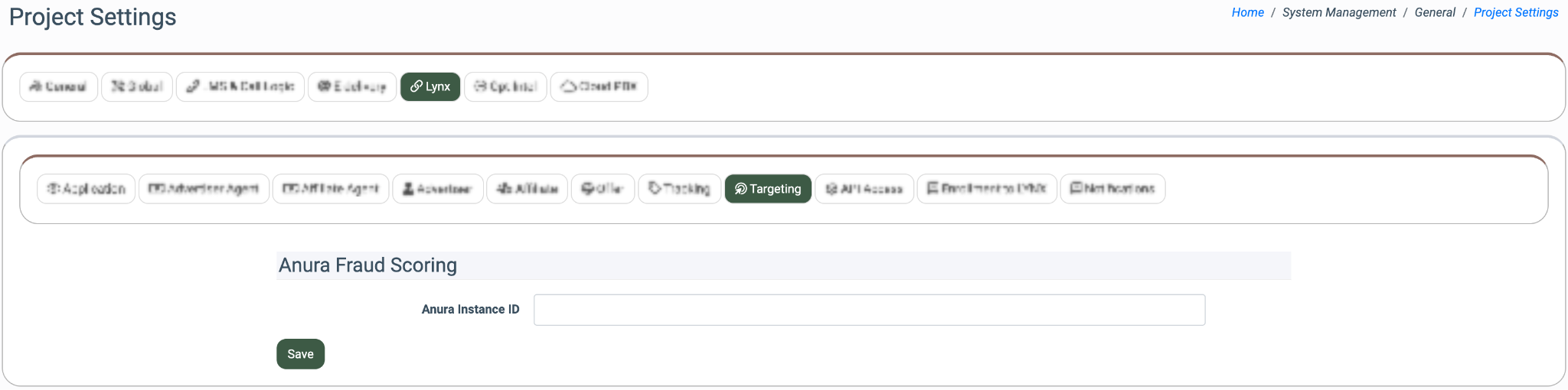 The “Targeting” tab allows you to enable and configure the Anura fraud detection service at the project level. By specifying your Anura credentials, you enable the system to analyze incoming traffic and assign fraud scores using Anura’s detection engine.