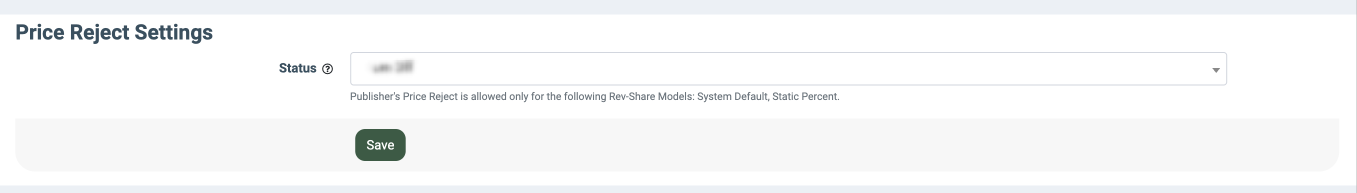 To enable the Publisher Price Reject feature, go to the Publisher Management > Publishers section, select the Publisher from the list, and click the “View” button in the “Action” column. Choose the “Advanced” tab and scroll down to the “Price Reject Settings” block. Select the “Turn On” option from the “Status” drop-down list and click the “Save” button to confirm the changes.