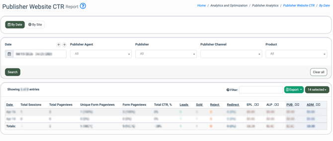 The “Publisher Website CTR” section provides a traffic conversion efficiency report. You can use different tabs to group the data in the report or filter it with appropriate fields.