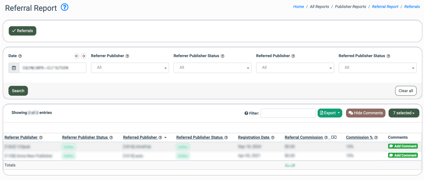 - Referred Publisher: Filter referrals by the publisher who registered via referral.