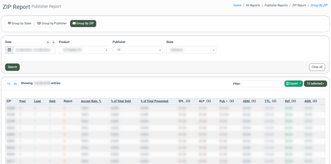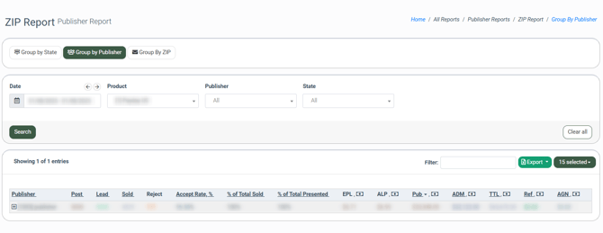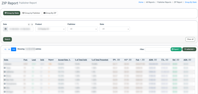 The Publisher ZIP report allows you to gather statistical information about the number of processed and sold leads, along with earnings of the Publisher, Admin, and the system, with the breakdown by states and corresponding ZIP codes.