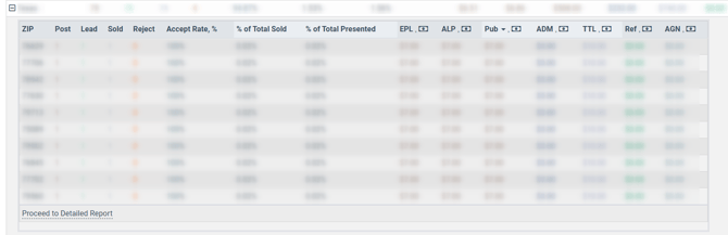 To view full information about lead processing for the selected state grouped by particular ZIP codes, click the “Proceed to Detailed Report” link in the ongoing collapsible section. You will be redirected to the “Group by ZIP” tab with the particular state selected in the “State” filter field.
