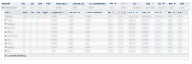 To view full information about lead processing for the selected Publisher grouped by particular states, click the “Proceed to Detailed Report” link in the ongoing collapsible section. You will be redirected to the “Group by State” tab with the particular Publisher selected in the “Publisher” filter field.