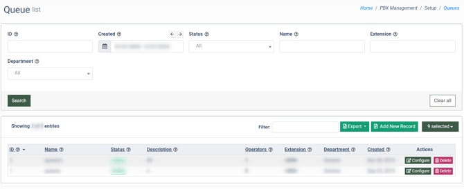 The Queue section allows you to view the operator queue list, where you can create a new queue or manage an existing one. A queue is a line of callers waiting to be routed to an available operator. To view the list of the queues, go to the PBX Management > Setup > Queues section.