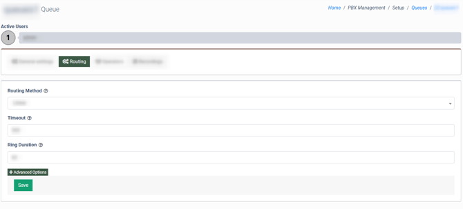 The “Routing” tab allows you to configure and manage the call routing for the Queue.