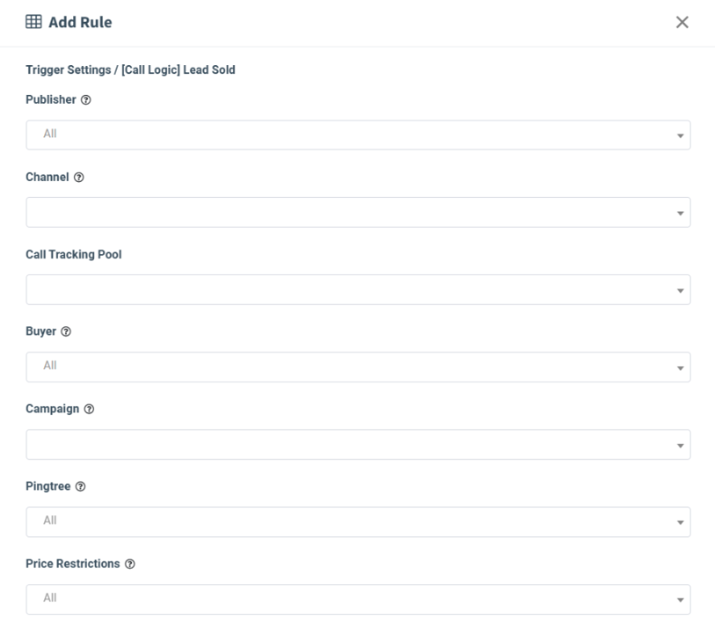 - Price Restrictions: Select the Price restrictions (Price is greater than 0, Price is greater than a certain value, Price is greater than or equal to a certain value, Price is lower than a certain value, Price is lower than or equal to a certain value, Price range inclusive). Note: The “Price range inclusive” value is available only for the “Lead Sold” and “Campaign Sold” triggers.
